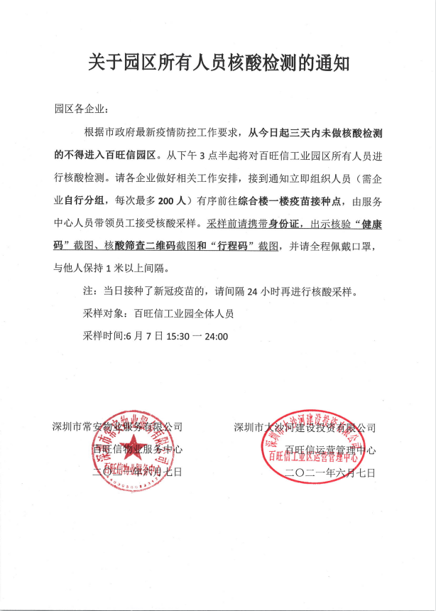 為響應我市關(guān)于疫情防控的最新要求,深圳市常安物業(yè)服務(wù)有限公司及下屬各服務(wù)中心全力配合南山區(qū)防疫部門、各轄區(qū)社區(qū)工作站全面覆蓋我司在管項目的核酸檢測工作。